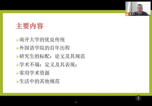 讲座中,李民围绕南开大学的优良传统、外国语学院的百年历程、研究生论文写作及其规范、学术不端的定义及其表现、常用学术资源、生活中的其他规范六个部分向同学们进行了阐述。