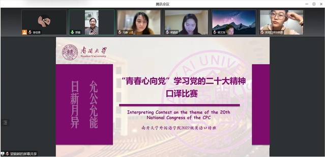 10月20日晚,2022级英语口译班团支部以线上腾讯会议的方式,成功举办了“学习二十大,青春心向党”主题知识口译竞赛。本次口译比赛紧紧围绕党的二十大报告展开,从专业外语学习视角出发,对报告认真研读,仔细分析报告英译所采取的翻译策略、方法、技巧。在比赛过程中,同学们聚精会神,以同声传译的方式口译报告相关内容,并在译后交流讨论、总结经验。本次班级竞赛活动得到了学院团委、英语系、公共英语教学部的大力支持,外国语学院副教授、硕士生导师郭嘉作为班导师出席此次会议并对同学们给予专业指导与建议。通过此次主题知识口译比赛,党的二十大精神进一步走进校园、走进班级,同时进一步增强了口译专业同学的英语专业理论与实践能力,为培养新时代南开外语人才增添动力。