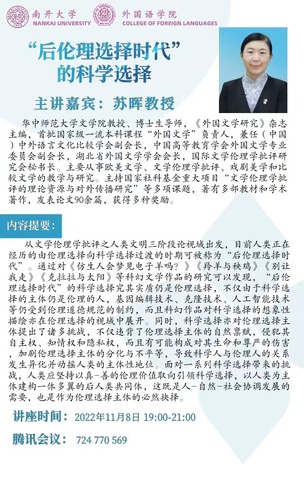 (通讯员 刘婧玲 王丽丹)2022年11月8日晚,华中师范大学教授、博士生导师、《外国文学研究》杂志主编苏晖教授为南开外院师生做了一场题为《“后伦理选择时代”的科学选择》的讲座。讲座开始前,院长阎国栋教授代表外院师生对苏晖老师的到来表示热烈欢迎和由衷感谢。近百名外院师生在线上聆听了本次讲座。