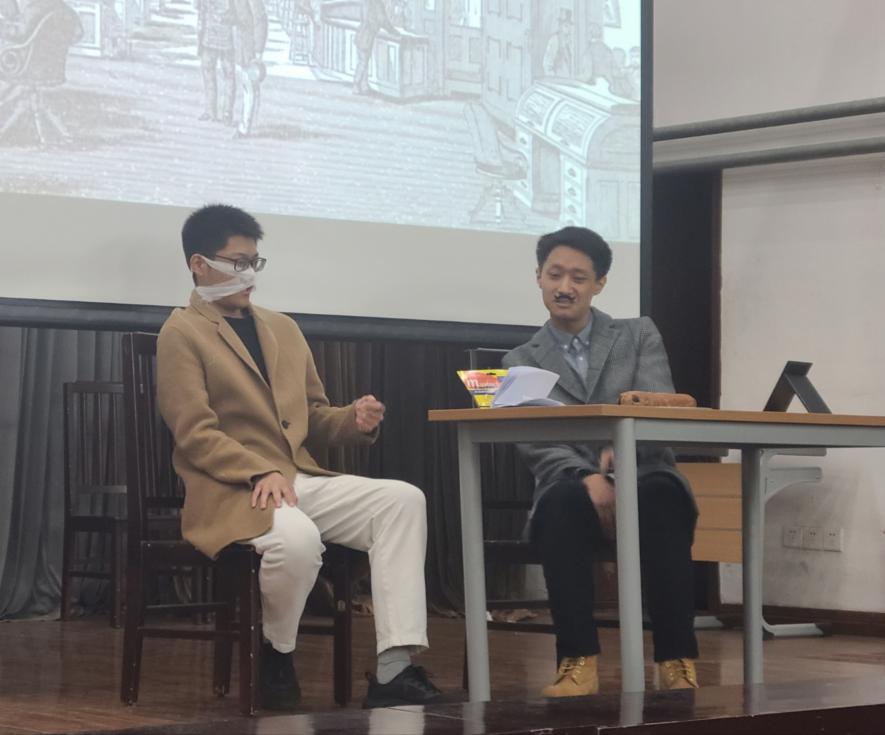 第四个节目是2022级硕士班带来的契诃夫经典小品剧目《变色龙》。四位同学凭借精湛的演技给大家留下了深刻的印象,将契诃夫的艺术品格原汁原味地呈现了出来。最后上场的2022级本科二班同学选取了契诃夫短篇小说《柔弱的人》为蓝本,并对其进行改编,加入了自己对当时俄国社会民主革命的理解。