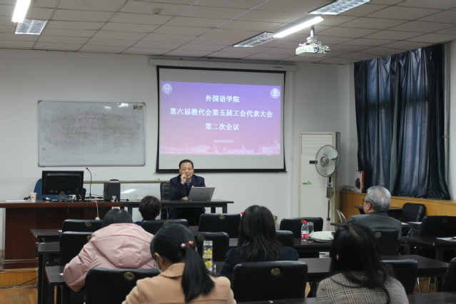 (通讯员 王泽璞)2月23日,外国语学院在主楼516室召开第六届教职工代表大会暨第五届工会代表大会第二次会议。外国语学院党委书记穆祥望,院长阎国栋,副书记、副院长相羽,副院长胡军、马红旗、王凯出席。英语系、日语系、翻译系、俄语系、德语系、法语系、西班牙语系、葡萄牙语系、意大利语系、阿拉伯语系、公共英语教学部和院行政教职工代表参会,教代会工会主席王凯主持会议。