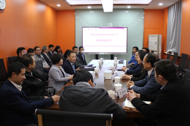 3月14日,北京语言大学校长刘利,副校长黄益方、聂丹,校长助理、人事处处长郁有学,校长助理、研究生院院长、汉语国际教育学部主任郭鹏,学校办公室、组织部、科研处、发展规划与学科建设办公室、教务处、国际教育管理处、孔子学院工作处、国际中文教育实践与研究基地、一带一路研究院、学生处负责人一行来访南开大学外国语学院。