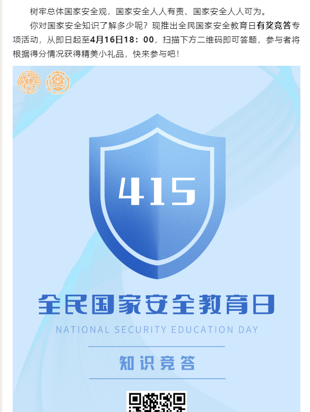 为增强国家安全基础知识宣传教育效果,调动师生积极性,4月15日,外国语学院工会联合外国语学院硕士生第一党支部推出全民国家安全教育日主题有奖知识竞答活动,带领大家温习党的二十大报告中关于国家安全的重要论述,了解国家安全工作在党和国家工作大局中的重要地位。国家安全基础知识竞答内容涵盖总体国家安全观、国家安全常识及《中华人民共和国反间谍法》等相关内容,吸引师生近百余人参加,反响热烈。