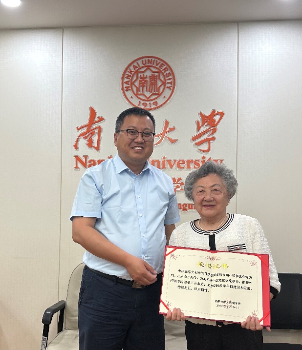 随后,李民教授为沈亦缘女士颁发捐赠证书。