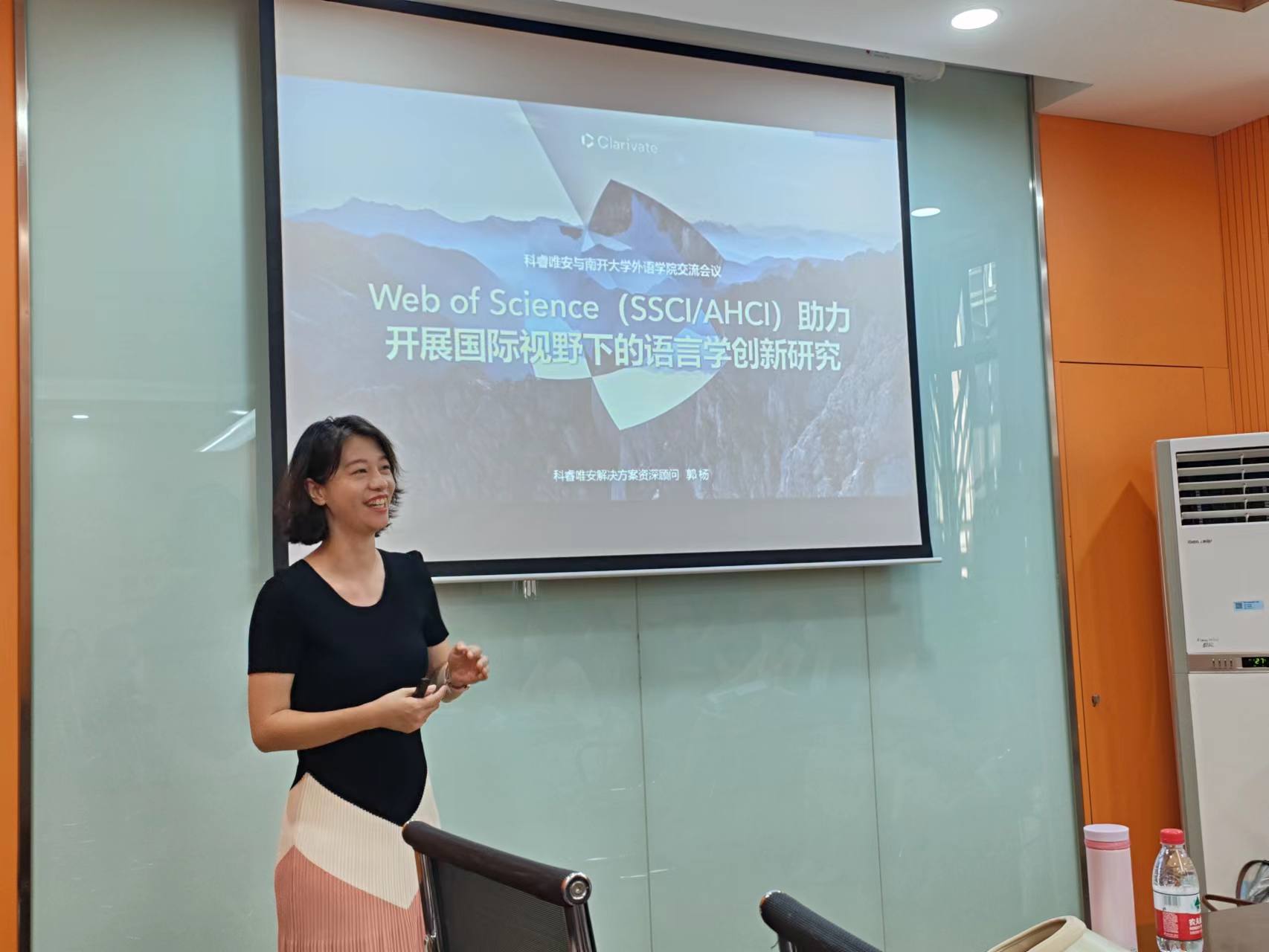 (通讯员 马悦 李民)为进一步开拓我院师生国际学术视野,拓宽学术资源利用渠道,助力外语学科创新发展,在南开大学图书馆副研究馆员张蒂老师促推下,2023年6月9日上午10点外国语学院邀请科睿唯安解决方案资深顾问郭杨女士、高级客户经理向诺女士、电子书产品经理丁艳君女士做了题为“Web of Science(SSCI/AHCI)助力开展国际视野下的外语学科创新研究”的学术讲座。讲座由外国语学院副院长李民教授主持,来自英语系、日语系、法语系、德语系、意大利语系、翻译系的部分教师、相关专业博硕研究生40余人参加了本次讲座。