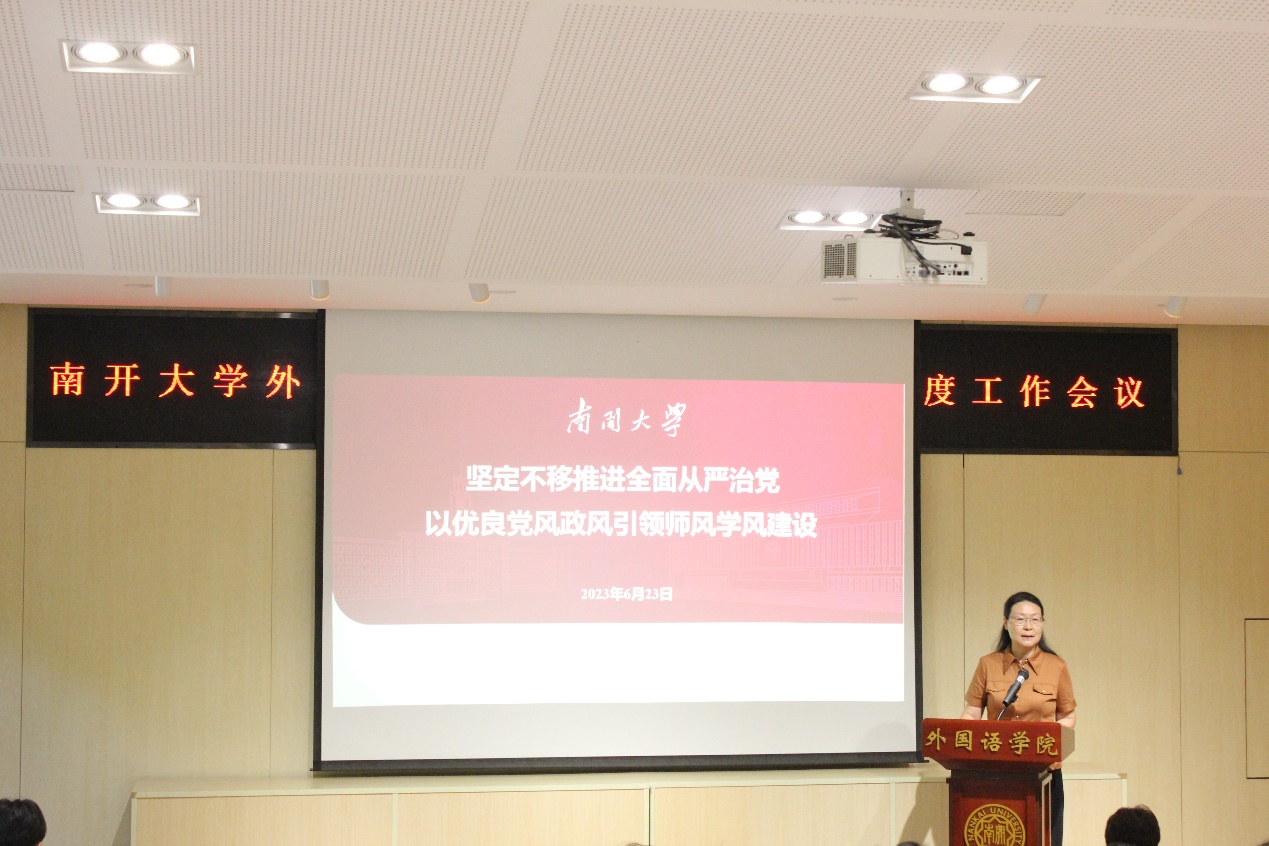 (通讯员:杨柳)6月23日,南开大学党委副书记、纪委书记赵美蓉来到外国语学院,以“坚定不移推进全面从严治党,以优良党风政风引领师风学风建设”为主题,为外国语学院全体老师做了专题报告。报告会由外国语学院党委书记穆祥望主持,外国语学院全体教师和行政人员聆听了报告。