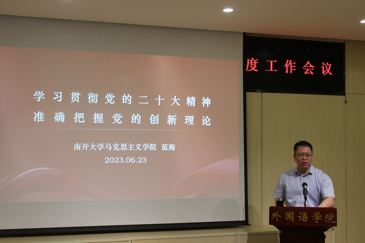(通讯员:杨柳)6月23日,南开大学马克思主义学院蓝海副教授为外国语学院全体教工做了题为“学习贯彻党的二十大精神,准确把握党的创新理论”的专题辅导报告。外国语学院院长阎国栋主持了报告会,外国语学院全体教工参加了学习。