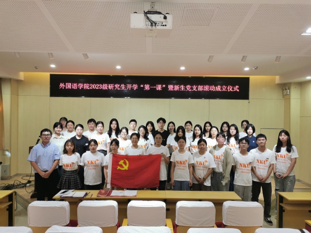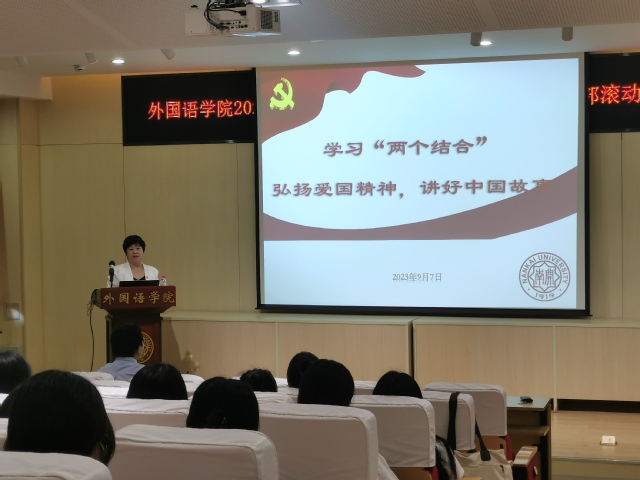 (通讯员 李艺帆 周文钰)9月7日,为贯彻落实党的二十大精神,深入学习领会习近平总书记关于“两个结合”的重要论述,外国语学院召开2023年新生党员“第一课”暨新生党支部成立仪式,外国语学院党委书记穆祥望担任主讲人。活动由外国语学院研究生辅导员周文钰主持,外国语学院2023级全体研究生新生党员参加。