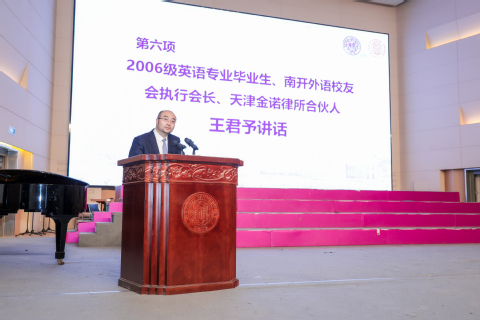 “南开是不是没落了?外语专业坑不坑?”,校友代表2006级英语专业毕业生、南开外语校友会执行会长、天津金诺律所合伙人王君予发表讲话,并与同学们探讨这两个话题。“大学三宝是精神、知识、校友,大学的其他东西我们都带不走。”他表示,社会对南开人有着正直坚韧的集体印象,南开精神常提常新,是我们最宝贵的财富,何谈没落;所有高校都享受了时代和技术的红利,没有人没落;南开校友活跃于政商学军各界,各地南开校友会兴旺发达,外语系校友更是在各行各业大放光彩,拥有强大的凝聚力,做出了卓越的贡献。南开的金字招牌敲门砖,退后一大步不妨碍我们在国内找任何一份工作,向前一小步可以敲开全球顶尖学府、机构的大门。南开,绝谈不上没落。对于第二个疑问,他谈到,无论一个人有多聪明,认识世界和认识自我总是需要一个过程,这不是一般高中生毕业的瞬间就能做到的。需要通过读书和交流,认识更广阔的世界和知识,进而认识自我的特点和兴趣,形成真实的理想,做出正确的人生选择。而外语提供了更广阔的视野和认识世界、与人交流的工具。而选择外语专业,但又没完全选定人生道路,这就是外语专业给我们的工具和时间福利。“南开外语绝不是通往梦想的阻碍,而是一个扎实的天梯。正如一个著名漫画的大反派所说,人的梦想,是不会泯灭的。”王君予以这样亲切而深刻的道理结束精彩的发言。