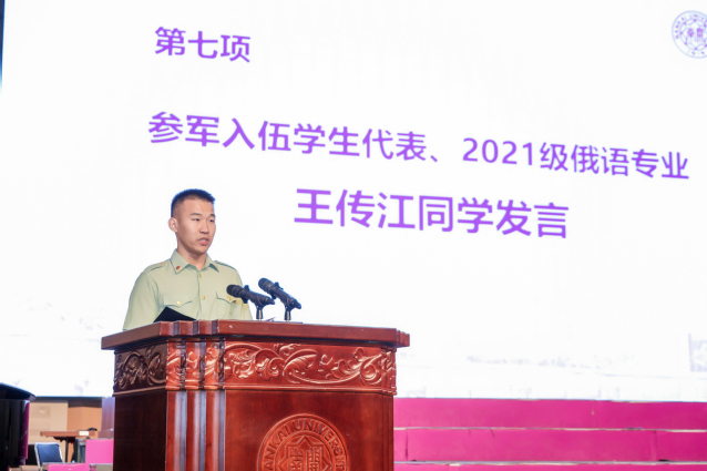 参军入伍学生代表、2021级俄语专业王传江同学作为老生代表发言。他立足于自己参军入伍的真实经历,用“小卒”的意象,从“桓桓士卒,胸怀家国”,“日拱一卒,月异日新”和“过河之卒,越难越开”三个方面分享了自己在外国语学院的收获与感受,并引用自己入学时阎院长的寄语鼓励大家:“强意志,百折不挠;读好书,百览不厌;写论文,百锻千练;求进步,百尺竿头;进赛场,百战百胜;做大事,百举百捷;谈恋爱,百年之好!”