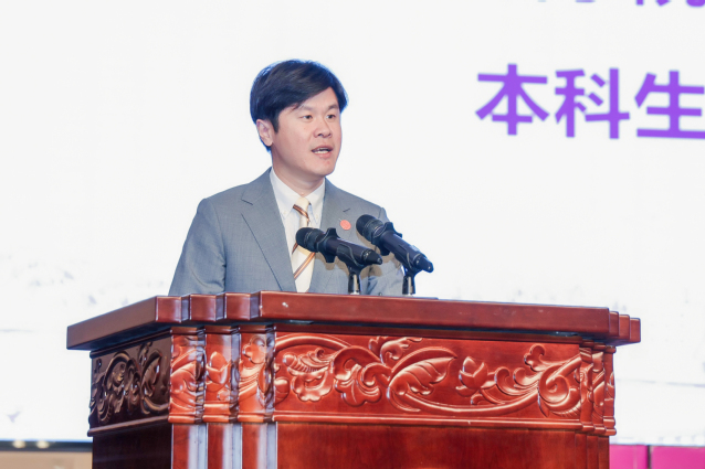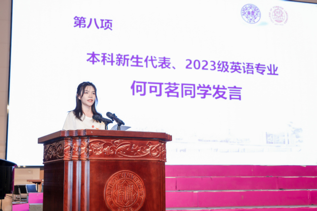 2023级英语专业何可茗同学作为新生代表发言。她以饱含哲思的“人生三问”——“我是谁?我来自何方?我将去往何处?”作为引入,分享了自己选择南开、选择外院的故事,并作为新时代南开外院人做出响亮回答:“我们立志成为具有‘外语专长、人文素养、国际视野、中国情怀、南开特色’的优质人才,我们定能负起爱国报国的信念,我们定能担起振兴中华的责任,我们定能在日新月异的南开外院,向明天启航!”