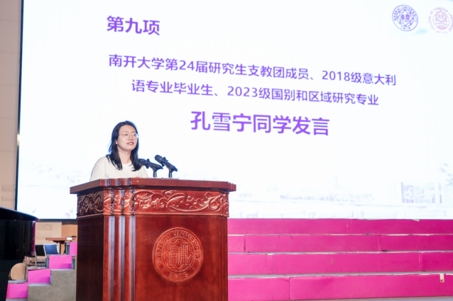 南开大学第24届研究生支教团成员、2018级意大利语专业毕业生、2023级国别和区域研究专业孔雪宁同学发言。她讲述了自己过去几年里参加省市实践调研、组织大型活动的经历与感悟,并介绍作为南开大学第24届研究生支教团成员前往西藏达孜支教的经历。“回头看,去捕捉那些意义深远的瞬间,一切行动的原点,一切出发的起点,都是在南开外院。而这,也更让我有底气走向未来”,孔雪宁这样说道。此次重返校园,她也在许多细微之处感受到了南开外院蕴藏的生机与活力。发言最后孔雪宁同学寄语,愿大家成为“知中国服务中国,知世界服务人类命运共同体”的南开外语人。