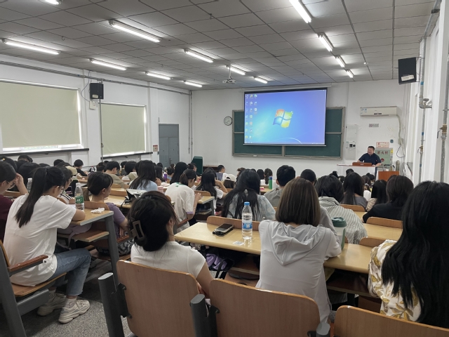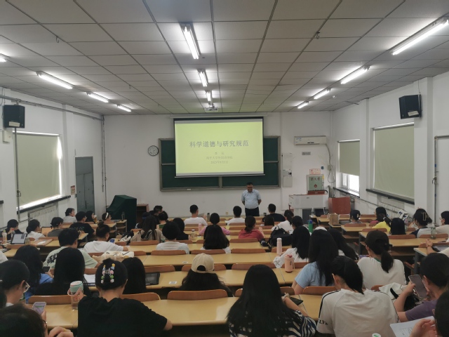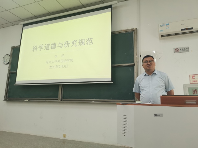 随后,学院副院长李民教授为2023级全体硕博研究生带来了“科学道德与学术规范”专题报告会。讲座中,李民以南开大学的优良传统、外国语学院的百年历程、研究生论文写作及其规范、学术不端的定义及其表现、常用学术资源、生活中的其他规范六个部分为主要内容进行报告。李民首先引述了南开校史和外院院史,指出专硕和学硕在培养方案和研究规划上的不同,提出作为外语人需要认清自己的专业优势与特点,需要做到习近平总书记视察南开大学时指出的“脚踏实地”,把小我融入大我,坚守“政治立场坚定、专业素养过硬”的南开底色,做好校训中的“允公允能”。随后,李民结合自己的研究方向和研究经历,强调了学术诚信和学术规范的重要性,并举了学术不端的相关反例以让同学们引以为戒、警钟长鸣。最后,李民对同学们表达了殷切的期盼,要做“生活中的排头兵”,遵规守纪,正确处理好师生关系。