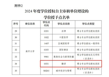 (通讯员 李民)近日,国务院学位委员会发布2024年度学位授予自主审核单位撤销和增设学位授予点名单,南开大学自主审核增设的翻译博士专业学位(DTI)授予点正式获批,成为全国首批能够培养高层次应用型翻译人才的两所教育部直属综合性大学之一。