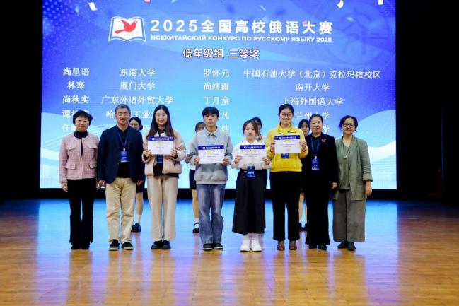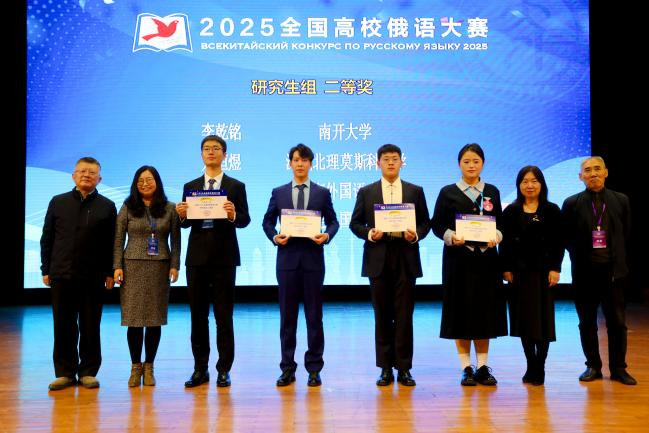 (通讯员 李乾铭 黄明拓)2025年10月25日~26日,由教育部国际合作与交流司主办、大连外国语大学承办的“2025全国高校俄语大赛”在大连外国语大学顺利举行。南开大学外国语学院2025级本科生尚靖雨获低年级组三等奖,2025级硕士研究生李乾铭获研究生组亚军。