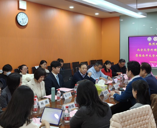 (通讯员 杨琳)2025年10月31日下午,北京大学外国语学院副院长付志明一行9人到访南开大学外国语学院调研。来访的还有:北京大学外国语学院外国语言学及应用语言学研究所所长胡旭辉,南亚学系副主任、外国语言与国际传播项目负责人张嘉妹,外国语言学及应用语言学研究所、数字人文与外语人才项目负责人苏祺,欧洲语言文学系、外国文学翻译实践项目负责人闵雪飞,教务办公室主任张丽娜,副主任李卉,教务秘书李宁与雷洋。南开大学外国语学院院长阎国栋、副院长李民、副院长王凯、英语系主任李莉、日语系主任韩立红、翻译系主任张智中、意大利语系主任杨琳、法语系主任刘吉平、西班牙语系主任谷佳维、翻译系(葡萄牙语)负责人胡婧、翻译系(阿拉伯语)负责人窦天娇、翻译系(德语)教师咸佩心、本科教学办公室主任孙曼歆出席会谈。