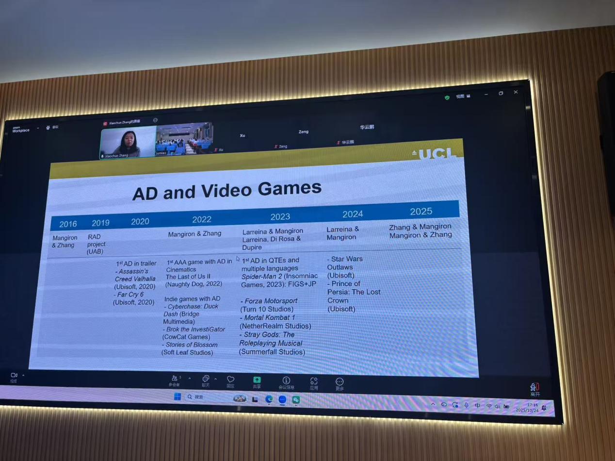 (通讯员 王程序)2025年10月24日下午,英国伦敦大学学院(UCL)翻译研究中心(CenTras)讲师张晓春博士,应邀为南开大学外国语学院师生做线上学术讲座,题为“Rethinking Game Localisation and Accessibility: AI, Inclusive Design, and the Future of Play”(再论游戏本地化与无障碍传播:人工智能、包容性设计与游戏的未来)。本次讲座由外国语学院翻译学研究中心主办,翻译学研究中心主任苗菊教授主持。翻译专业硕士研究生、本科生及翻译学研究中心部分教师在外国语学院111学术报告厅集中聆听讲座。