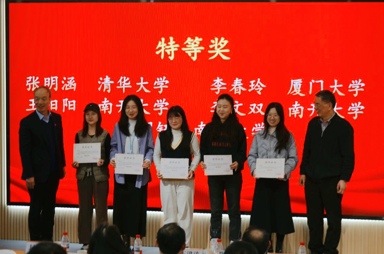 特等奖:张明涵 清华大学;王阳阳 南开大学;翟润钰 南开大学;李春玲 厦门大学;李文双 南开大学。北京外国语大学王文斌教授和清华大学封宗信教授为获得特等奖的同学颁奖。