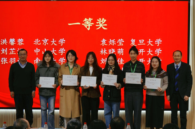 一等奖:洪馨蓉 北京大学;刘芷涵 中山大学;张羽西 南开大学;李晓冉 北京航空航天大学;夏尔瓦尼木·努尔麦麦提 北京外国语大学;袁烁莹 复旦大学;林晓萌 南开大学;刘偲佳 南开大学。北京外国语大学许家金教授和南开大学张文忠教授为获得一等奖的同学颁奖。