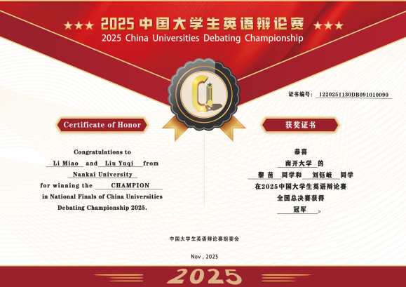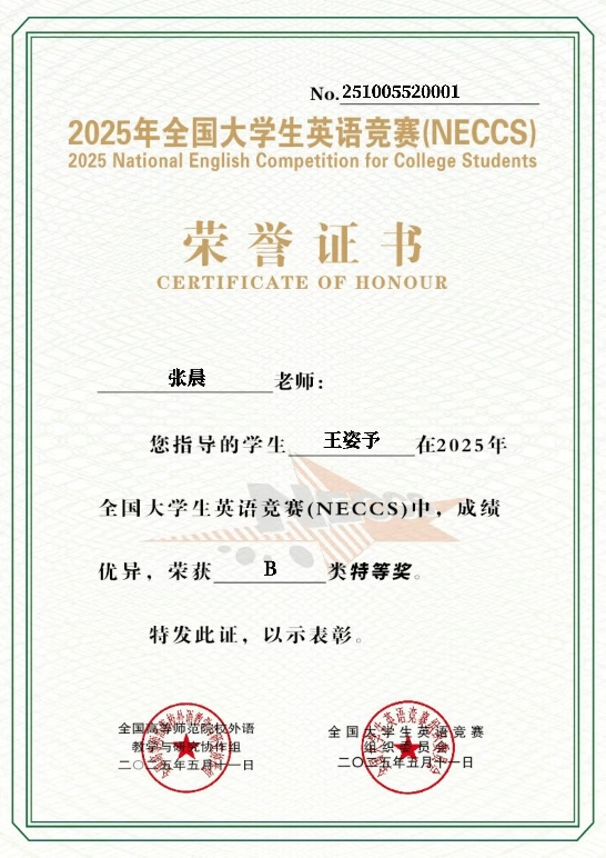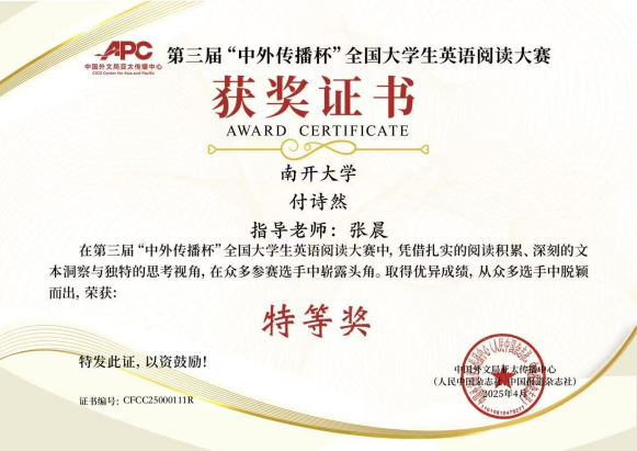 英语系坚持以学生发展为中心,持续加强高层次、创新型人才培养。本年度学生在各类高水平竞赛中表现突出,本硕博学生共获得国家级奖项 28项,其中包括国家级特等奖3项、一等奖 6项、金奖4项,在全国性赛事中取得突破性成果。三名教师荣获“优秀指导教师”证书,充分彰显了英语系拔尖人才培养成效。
