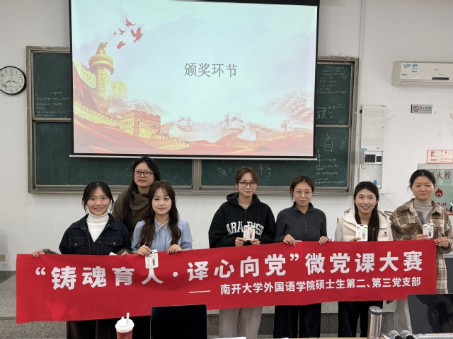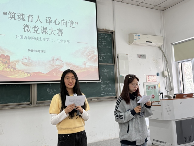 南开新闻网讯(通讯员 邬佳启 周文钰)为深入学习贯彻习近平新时代中国特色社会主义思想,巩固拓展主题教育成果,引导广大研究生党员筑牢信仰之基、补足精神之钙、把稳思想之舵,3月29日下午,外国语学院硕士生第二、三党支部在七教209教室联合举办“铸魂育人守初心 译心向党担使命”微党课大赛。本次活动以党的十八大以来历次主题教育为主线,通过以赛促学、以学促行的方式,展现新时代学子的理论素养与时代担当。